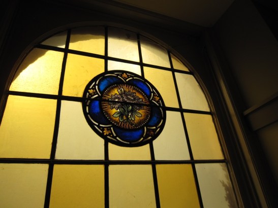 View of one of the existing stained glass medallions in the windows that were removed for the installation of new classroom doors.