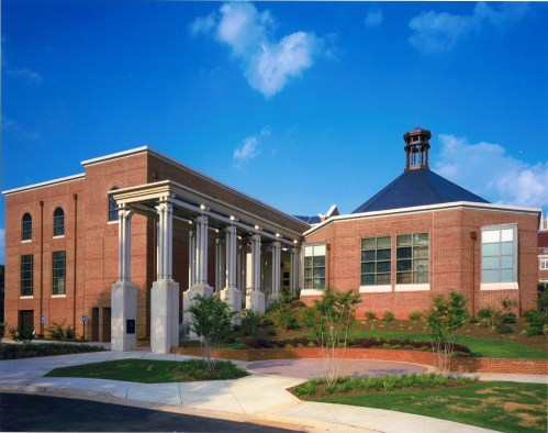 Newnan City Administration Building – Street Entry. The key site planning concept for this project was to provide for both street and parking lot entry. This need led to the 3-part massing (from left to right) of the Council Chambers, the double sided entry and canopy, and the 3 story office wing.